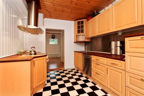 Aubo profilert kjøkkeninnredning med heltre benkeplate og stålplater over benk. Utslagsvask. Avsatt plass til hvitevarer. Kjøkkenventilator med kullfilter. Opplegg for oppvaskmaskin.