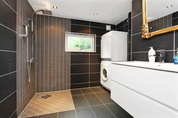 Bad med glatt, hvit servantinnredning, dusjhjørne og vegghengt wc. Opplegg for vaskemaskin.