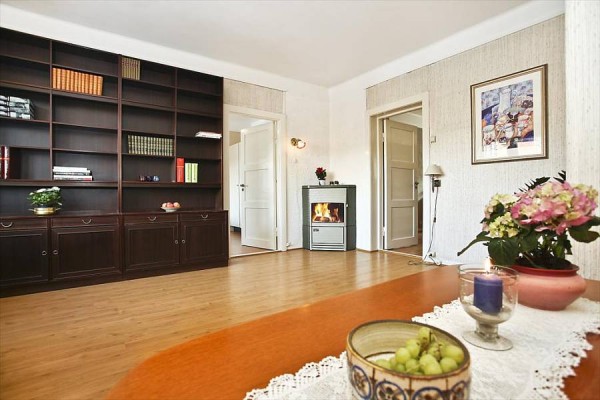 Romslig stuen med vedovn og utgang til nyere balkong. Laminat på gulv, tapet på vegg og malt himling.