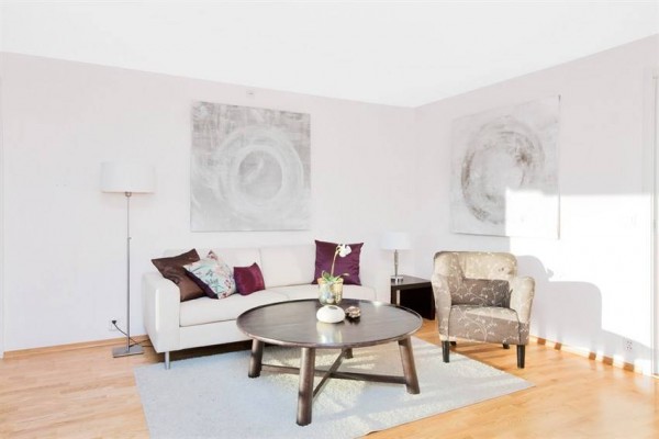 Entré, bad, stue med utgang til stor solrik balkong og delvis åpen løsning til kjøkken, soverom.