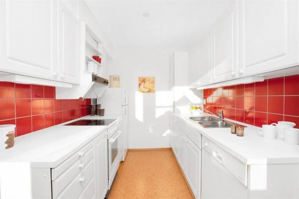 Kjøkken - Hvit profilert kjøkkeninnredning fra Norema. Fliser mellom overskap og laminert benkeplate, vifte over komfyr, dobbelkum med ettgreps blandebatteri og opplegg for oppvaskmaskin.