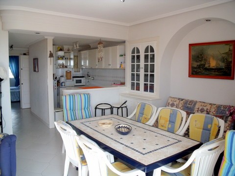 Leilighet til salgs i Torrevieja, Los frutales-La Rosaleda. Leilighet i første etasje i bungalow stil. 3 soverom og 2 bad. Stor terrasse med havutsikt. Gemmensam bassenget.