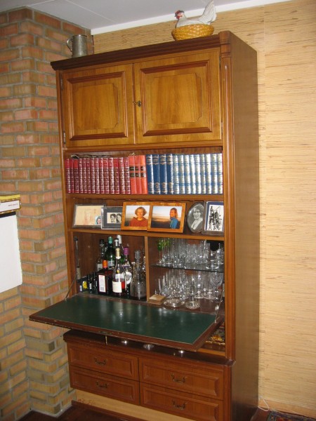Et praktiskt kombi skap, bar ,boeker, soelvtoey, etc passer inn mot en vegg paa venstre side