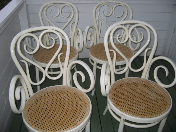 Fire (4) wiener cafe stoler med armlener, hvitlakerte og med rotting seter til salgs