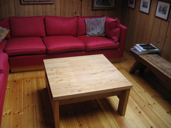 Lite salongbord i ubehandlet furu ca. 90x90 til salgs