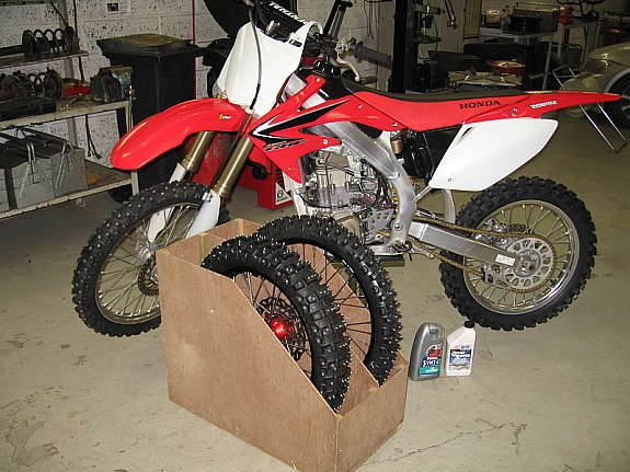 Strøken og svært lite brukt crosser, 9 timer, loggført + timeteller montert fra ny. Følger med komplett ekstra hjulsett med piggdekk inkl skiver for / bak, drev, hylser.(nypris 12000,-) Hjulsettet er prøvd engang og som nytt,se bilder! Følger også med praktisk oppbevaringskasse for disse hjulene. Reservedelskit fra Honda (stempel, pakninger, hendel mm), rep/vedlikeholdsmanual og ekstra luftfilter. Ny olje + filter på både motor og girkasse (adskilt system på crf) Sykkelen er helt i orden, svært godt oppfulgt i de få timene den har gått.Eies av fagmann. Sist brukt 4 apr. 2009, bare varmkjørt engang iblandt etter dette. Lagret i hus. Mye sykkel for pengene. (Ny idag koster veil 69900,- + evt ekstra hjul )